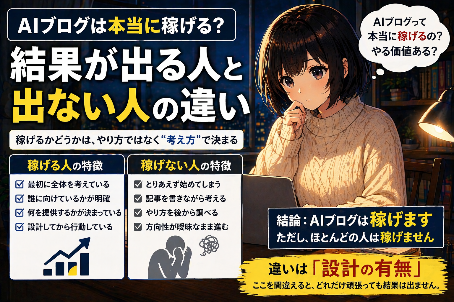 このあたりは、AIブログで稼げない人の特徴をまとめた記事でも詳しく触れていますが、
