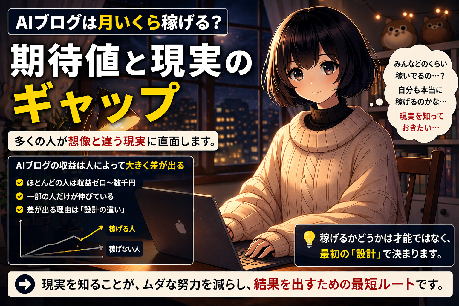 このあたりは、AIブログが稼げない理由を整理した記事でも触れていますが、